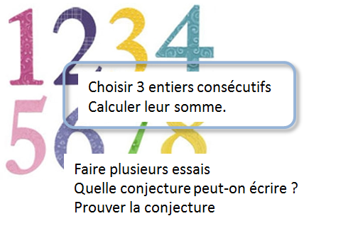 Sur un temps de mise en train Cette activité est mise en œuvre avec les objectifs suivants : - mettre en valeur une démarche de recherche : essais, conjecture, preuve, - montrer l'intérêt des propriétés algébriques (distributivité simple, double distributivité, commutativité...) dans le mécanisme de preuve, - convaincre de la nécessité du passage au calcul littéral pour prouver une affirmation sur une infinité de valeurs, - mettre en place des stratégies de modélisation algébrique de problèmes arithmétiques, - revenir sur l'écriture des nombres consécutifs, des multiplesSynthèse: Somme de trois nombres consécutifs