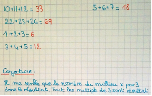 En plus de la propriété arithmétique découverte et prouvée, la somme de trois nombres consécutifs est un multiple de trois, l'institutionnalisation peut mettre en avant : - on ne prouve pas la conjecture avec des exemples, il faut utiliser des lettres et des propriétés. - la preuve peut être plus facile ou plus difficile suivant le choix de l'écriture des nombres consécutifs.Réactions d'élèves: Somme de trois nombres consécutifs